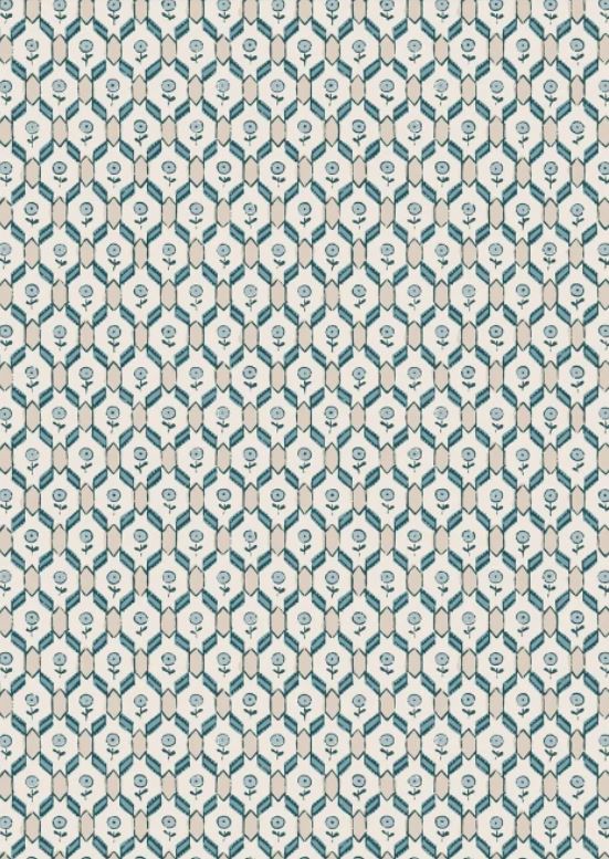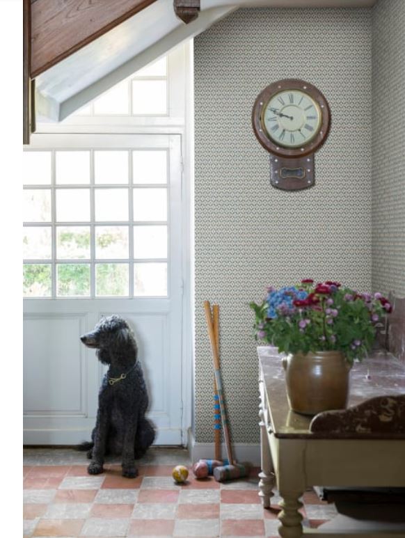 This hand painted Domino design was once the cover of a French book about the discovery of America published in 1781. The simple floral and geometric pattern evokes cherished memories of an old paper-lined dresser in a French country kitchen.