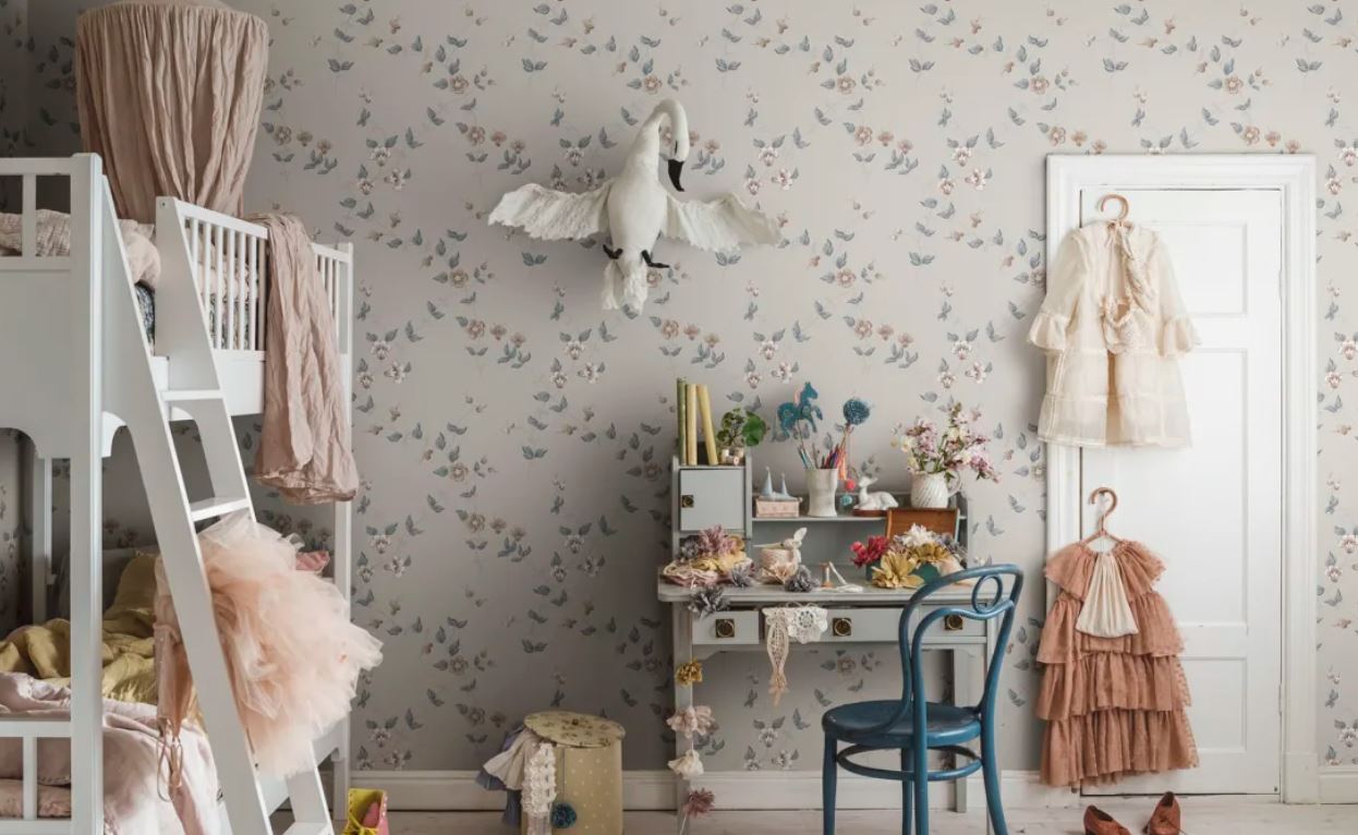 Guest room number 13 was said to be haunted and that any wallpaper adorning the walls kept falling down. In the end, it was decided to paint delicate floral patterns directly on the wall using a thin brush. Inspiration was drawn from an 18th-century wallpaper, located in one of the castle's wardrobes. Recreating these painted walls as a wallpaper feels like breathing new life into a work of art. A natural simplicity with a nuanced expression.